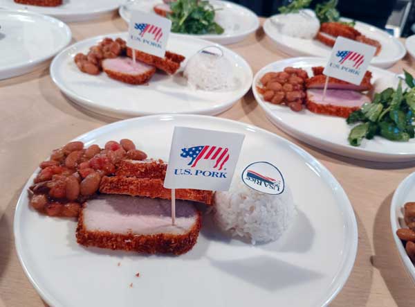 - Tonkatsu de lomo de cerdo americano, arroz de Estados Unidos al vapor, frijoles de la olla y plátano macho