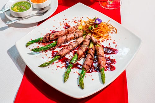 Desde el inicio, la experiencia sorprende, por ejemplo, la entrada del molcajete de guacamole con gusanos de maguey y chapulines y chips de maíz azul rompe cualquier expectativa tradicional, mientras que la ensalada de codorniz rostizada o los espárragos envueltos en filete de res al teriyaki muestran la fusión entre técnica y creatividad.