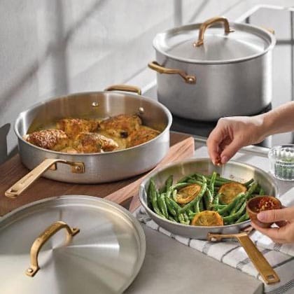 Una colección de acero inoxidable con acabado cepillado y textura inspirada en la piedra de río. Su construcción de cinco capas garantiza una distribución uniforme del calor y compatibilidad con todo tipo de estufas, incluida la inducción. Su estética aporta un estilo orgánico y contemporáneo.