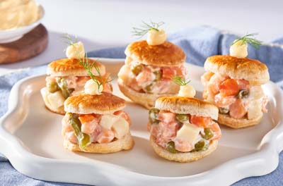 En un recipiente se mezclan Mayonesa y Ensalada de Verduras La Costeña con alcaparras, salmón, eneldo, sal y pimienta. La preparación se coloca dentro de volovanes cortados por la mitad, se cubren y se presentan listos para servirse.