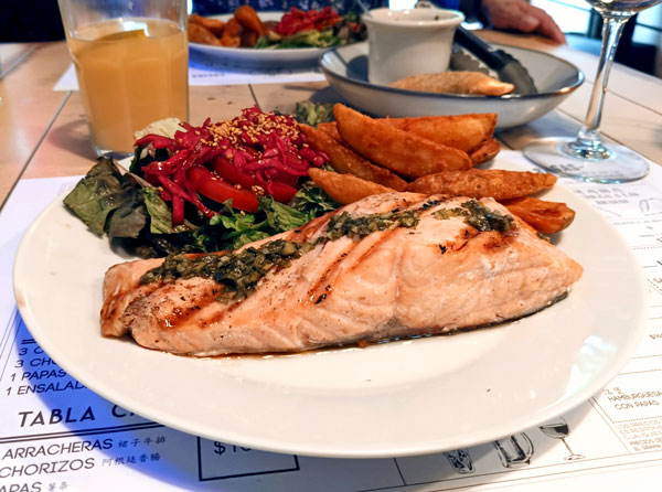 Para quienes buscan variedad, el menú también ofrece opciones de mar y tierra como el salmón de 300 gramos a la brasa, servido con ensalada y papas de gajo, o el atún sellado, ideal para quienes prefieren sabores más ligeros. El pollo a las brasas completa la carta con alternativas que se ajustan a todos los gustos.