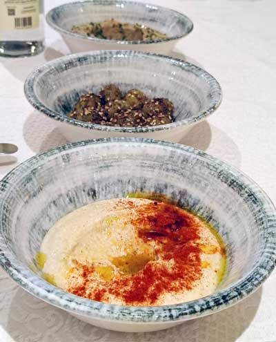 Iniciamos con un rico pan estilo árabe recién hecho y Tapenade de Pasta de aceitunas, alcaparras, anchoas y aceite de oliva Francia. Hummus, hecho de garbanzo, con tahini (pasta de ajonjolí con asar) y aceite de oliva. Medio Oriente y Baba Ganoush, Pasta o paté de berenjenas asadas de origen árabe. Líbano.