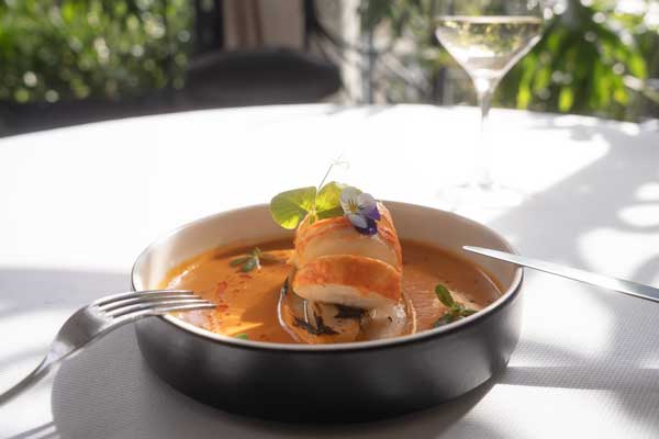 La cena inicia con un brioche hojaldrado con foie gras, chutney de higuera, pistache, salsa unagi y macadamia, un bocado elegante que marca el tono de la noche. El segundo tiempo presenta una langosta con espuma de curry rojo, balanceando delicadeza y profundidad de sabor.