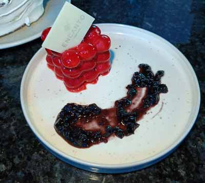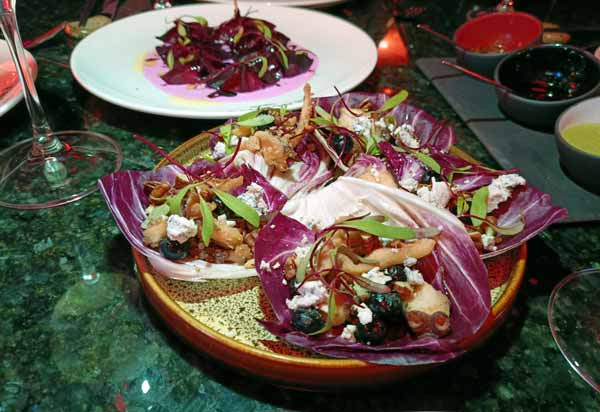 - Bocados de pulpo con radicchio y blueberries: un balance entre el dulzor de los frutos rojos y la textura marina, inspirados en la técnica catalana mar y montaña.