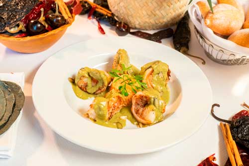 - Mole Verde Tradicional. De origen prehispánico, el pipián es una de las salsas más antiguas de México y antecede al mole en su forma actual. Elaborado a base de semillas —principalmente pepita de calabaza—, hierbas frescas y chiles verdes, destaca por su sabor vegetal y textura sedosa. Es una expresión pura y ancestral de la cocina mexicana.