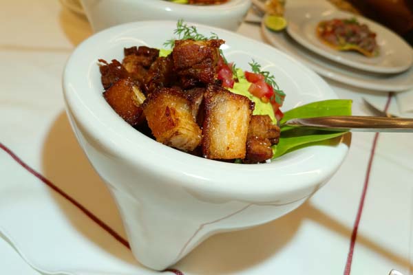 - Guacamole con Chicharrón de Pork Belly: Una joya de texturas. El aguacate cremoso, con el toque justo de limón y cilantro, sirve de cama para trozos de pork belly cuya piel alcanza un crujido metálico y un interior jugoso.