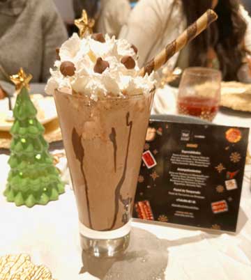Y para quienes prefieren algo más dulce, también se sirvió un chocolate caliente decorado con crema chantilly, espeso, reconfortante y perfecto para cerrar la velada con una sonrisa.