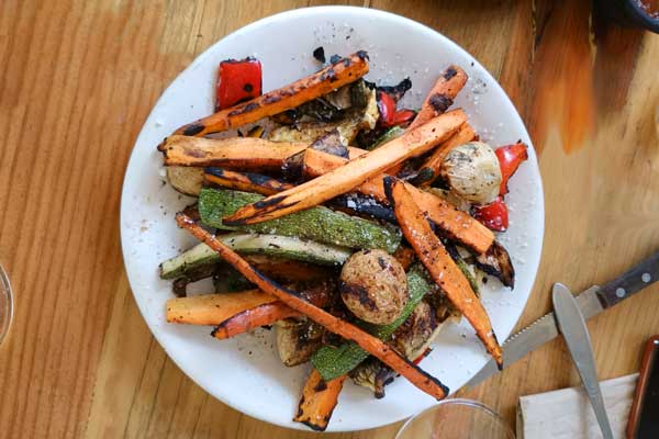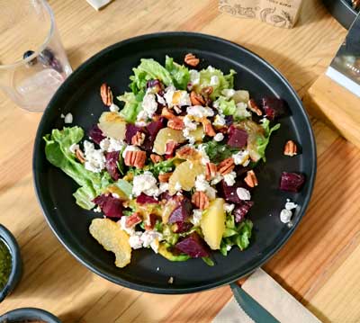 - Ensalada de betabel rostizado con suprema de naranja, queso de cabra, mix de lechugas, espinaca y nuez, aderezada con miel mostaza.
