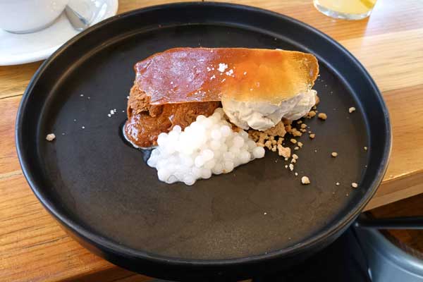 El cierre del menú degustado llega con un volcán de chocolate, servido con helado de plátano, caramelo salado y tapioca, un detalle pensado para limpiar el paladar y equilibrar la intensidad del chocolate. Un final contundente y elegante para una cena de celebración.