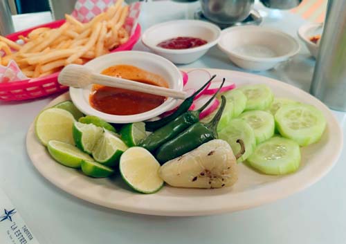 Llegamos con hambre de explorar y con la misión de probar lo más representativo de su carta. Primero, llegó el plato de rico pepino cortado en rodajas, los chilitos cuaresmeños toreados, los rábanos, la salsa pozolera y un buen montón de limones para apachurrar sobre los tacos. Además nos presentaron 4 salsas que ajustan a todos los gustos, tres de ellas muy picantes.