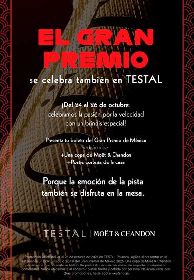 Los comensales que presenten su boleto o pase del Gran Premio de México recibirán una copa de Moët & Chandon Imperial Brut de cortesía, además de un postre emblemático de la casa , una cortesía pensada para consentir los paladares más exigentes, sin comprometer la esencia de la cocina mexicana que distingue a TESTAL.