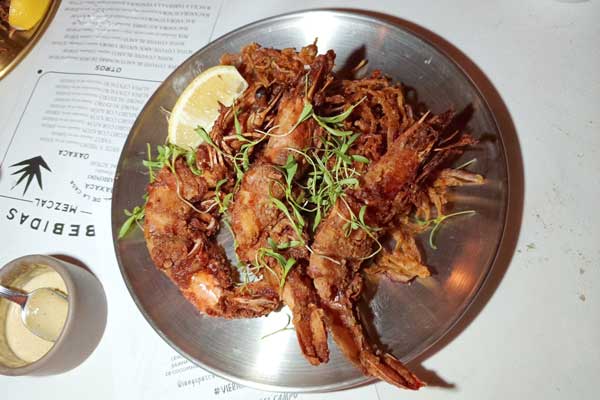Camarones cristal con cabeza, enharinados, fritos y servidos al limón.