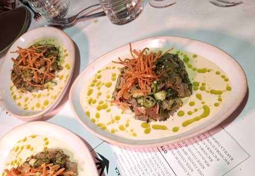 Ceviche de robalo y marlín ahumado en frío, con pepino, juliana de tortilla y chimichurri de hoja santa, servido en caldo de coco y mandarina con aceite de cebollín.